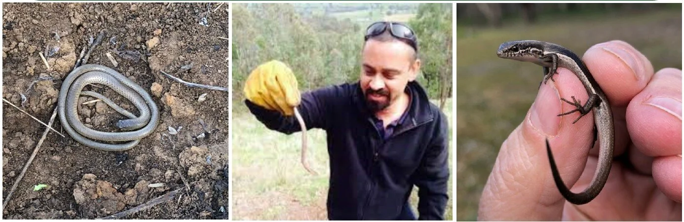 L: Olive Legless Lizard, C: Reptile expert Dr Damian Michael, R: Boulenger’s Skink